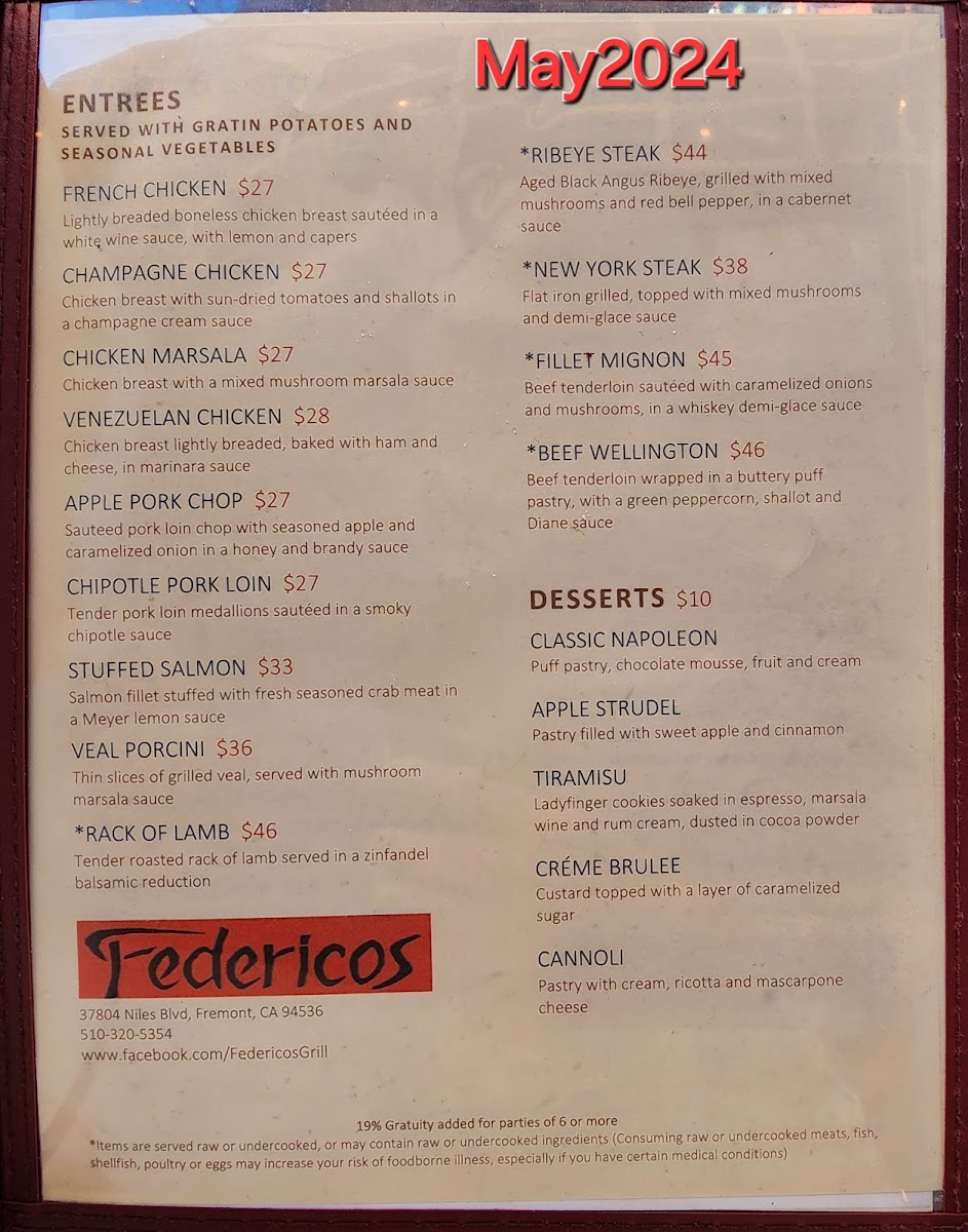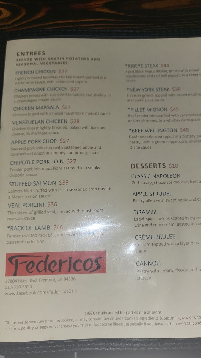 Welcome to Federicos' Grill & Catering, a culinary gem nestled in Fremont, CA. Known for its exceptional menu, Federicos' showcases a delightful array of appetizers such as Bruschetta and Coconut Shrimp, creating the perfect start to your meal. Their specialty salads, including the classic Caesar and refreshing Caprese, cater to a variety of tastes.